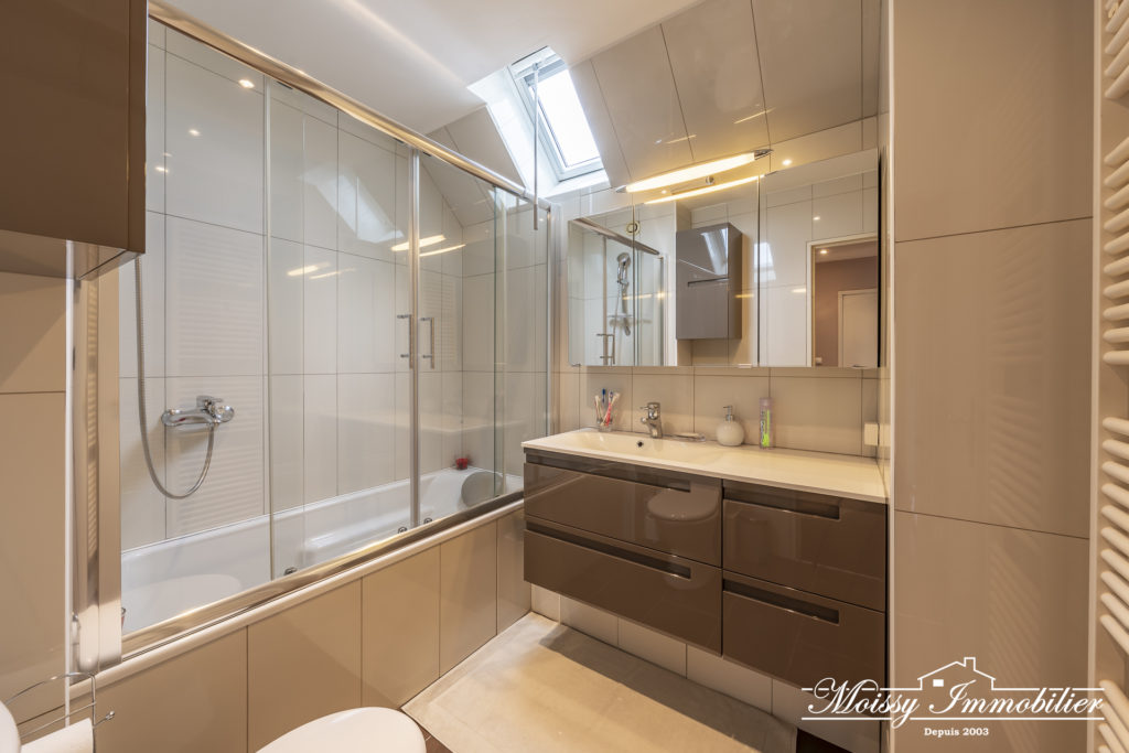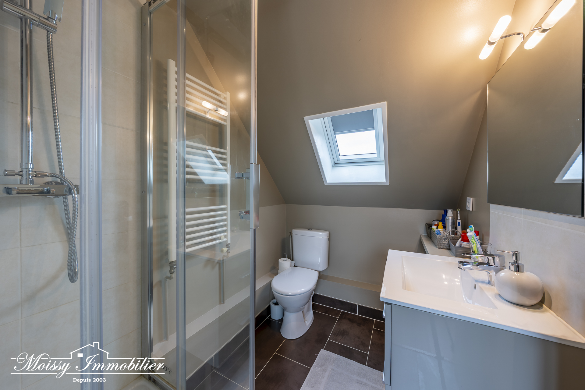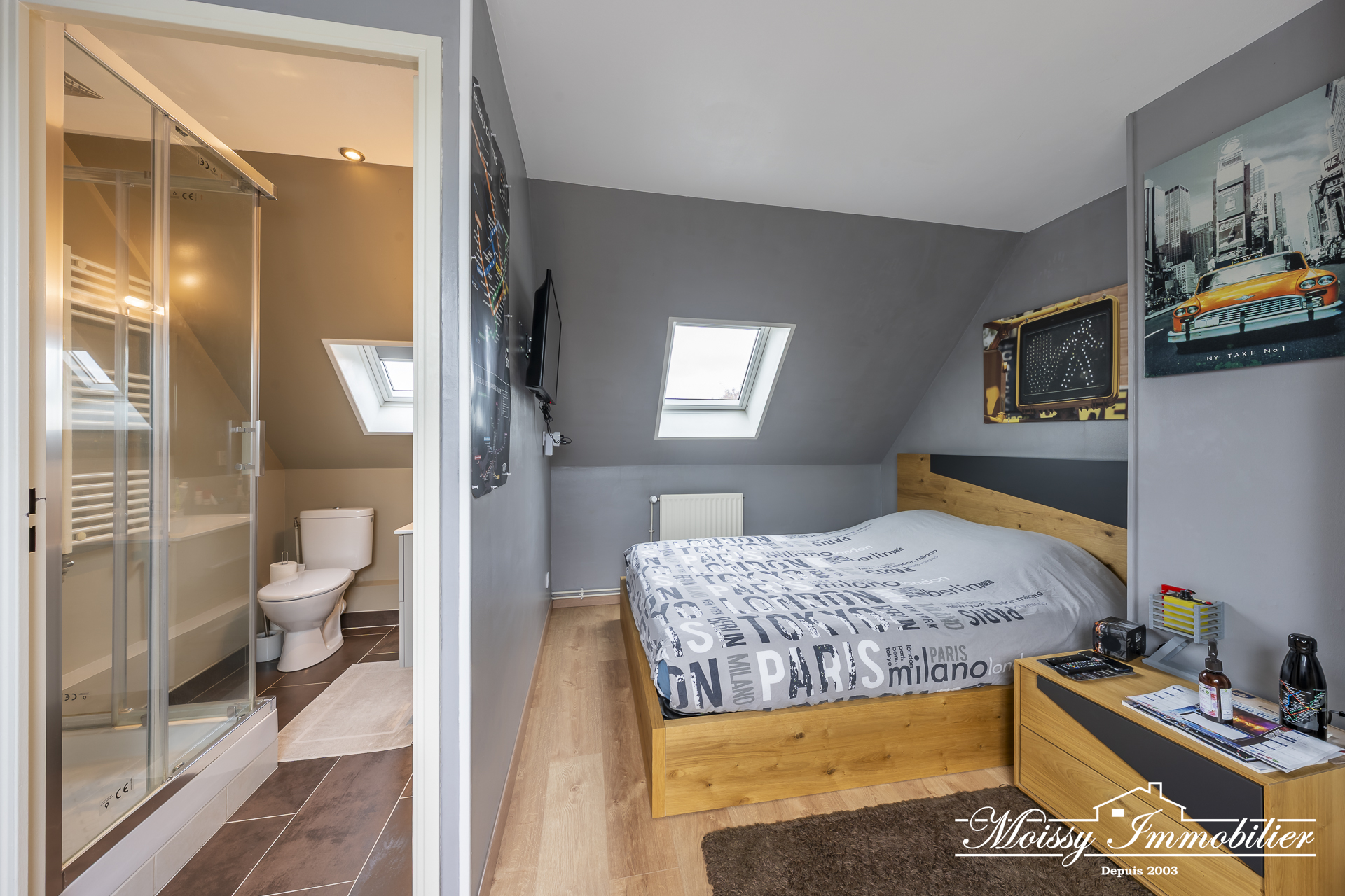 A l'étage : beau dégagement, une salle de bains toute équipée, avec des toilettes intégrées, deux chambres dont une de 18 m², également pourvue de rangements. Au deuxième étage : une suite parentale, équipée d'une salle d'eau entièrement meublée et aménagée, incluant des toilettes intégrées, un dressing et des rangements.